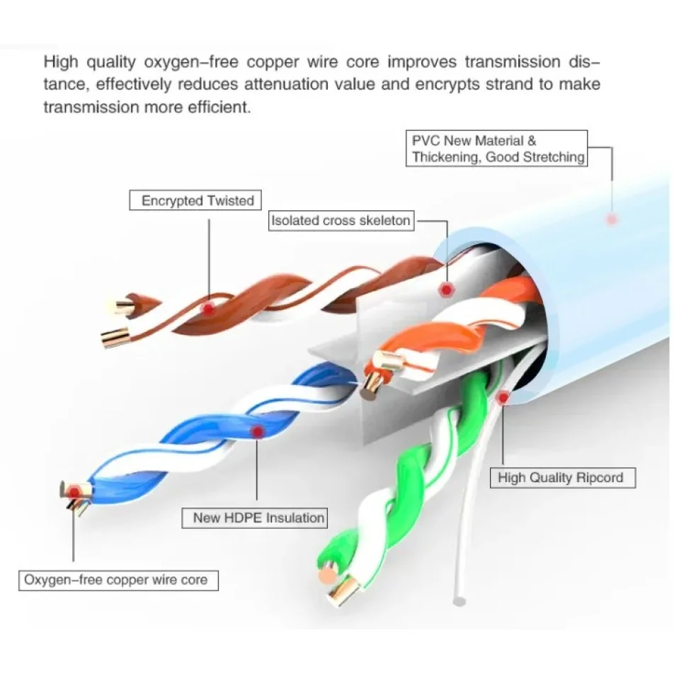 এর UTP (Unshielded Twisted Pair) ডিজাইন সিগন্যাল ইন্টারফেরেন্স কমিয়ে ডাটা ট্রান্সমিশন স্থিতিশীল রাখে। 0.50mm thickness কন্ডাক্টর কেবলটিকে শক্ত এবং দীর্ঘস্থায়ী করে তোলে, ফলে দীর্ঘ সময় ব্যবহার করা যায়।