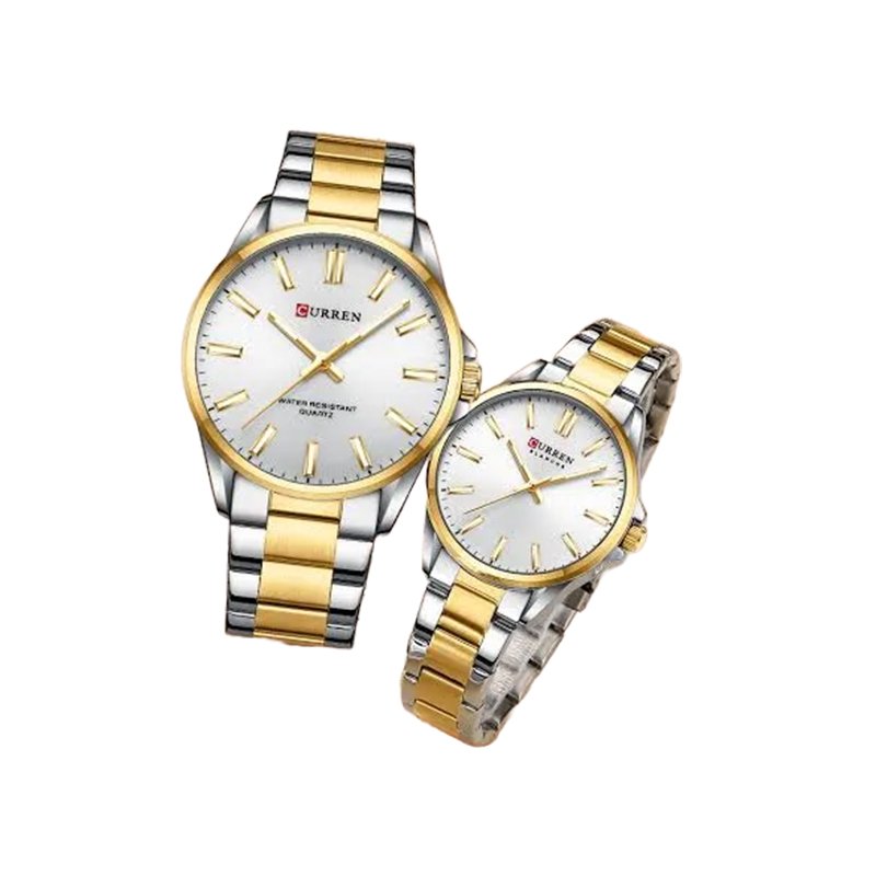 Curren 9090 Couple Quartz Stainless Steel Analog Watch- (Silver & Golden White)